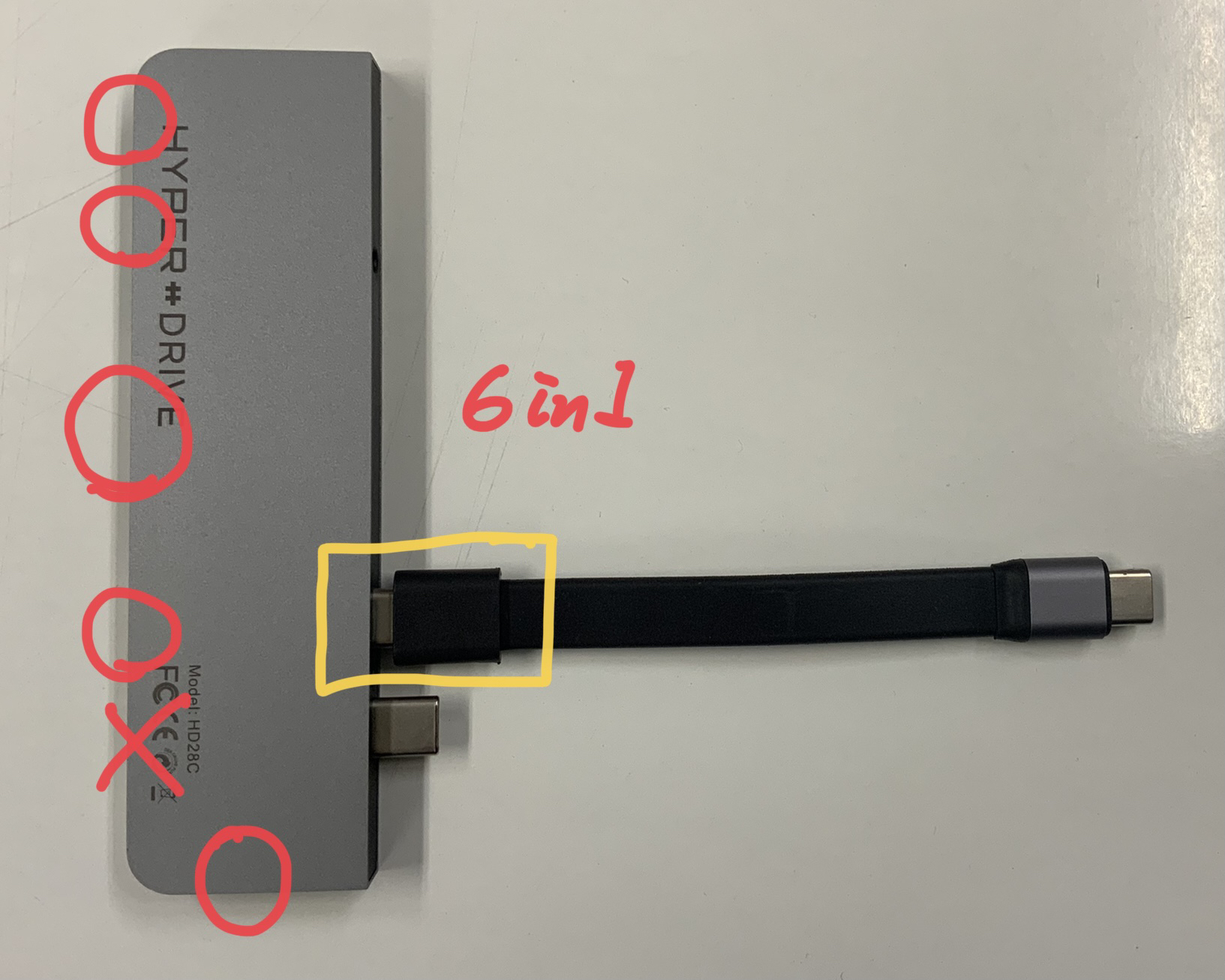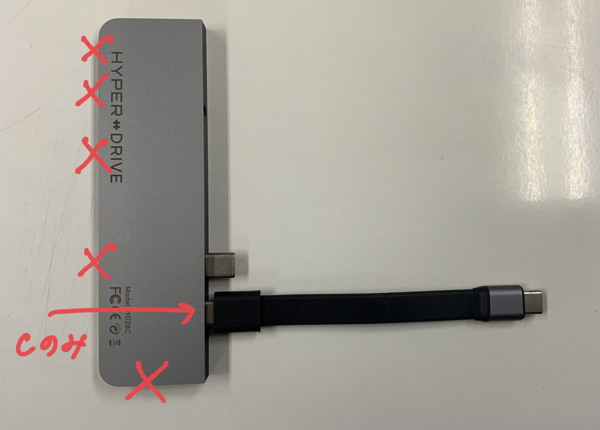 上側のCポートに差し込んだ場合は写真で〇のあるポートが動作し、6in1として使用ができます。