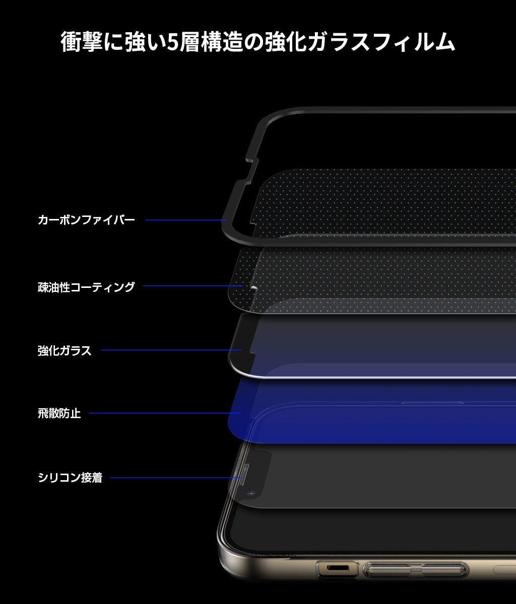 カーボンファイバー、疎油性コーティング、強化ガラス、飛散防止、シリコン接着の5層構造のガラスフィルムです。