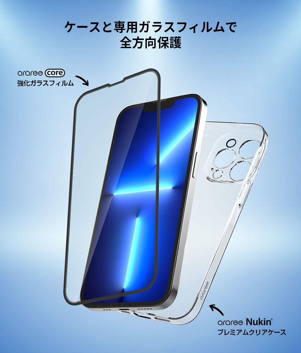 本製品は、専用強化ガラスフィルムと薄型クリアケースを組み合わせたオールインワンケースで、360度全方向からすき間なく保護します。