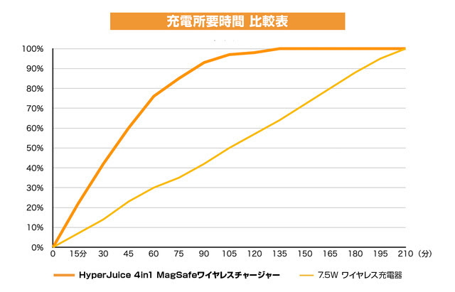 Apple社によるMade for MagSafe認証を受けています。MagSafeテクノロジーで、最大15Wの電力でiPhoneを安全かつ高速にワイヤレス充電できます。1時間で0%から75-80%まで充電でき、従来の7.5W充電より100分以上早く同充電容量まで到達します。