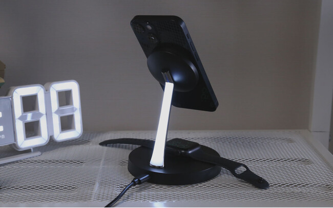 当製品は、1つの充電エリアで、iPhone・AirPods・Apple Watch・Androidスマートフォンなどのワイヤレス充電に対応できるマルチワイヤレスパッドが特徴の充電スタンドです。MagSafe仕様のiPhoneシリーズに対応するマグネット式スタンドとマルチ充電パッドを備え、最大2台までの同時充電に対応します。日常生活で欠かせないアイテムとなったウェアラブルデバイスをまとめてスッキリと充電することができます。背面にLEDバックライトも搭載し、モダンかつシンプルなデザインに仕上げました。