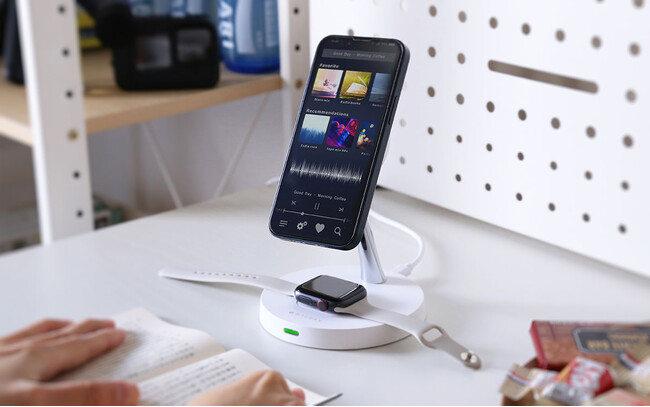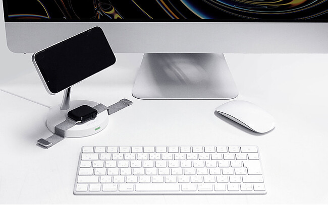 スタンド基部にあるマルチワイヤレス充電パッドでは、Qi対応機器やAirPodsのみならず、Apple Watchも充電可能です。Apple Watch専用の充電スペースを必要とせず、ひとつのパッドでマルチに充電できます。