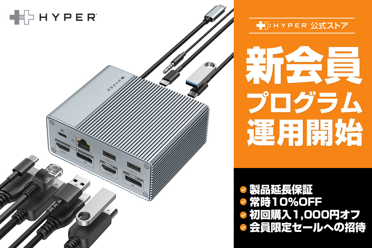 HYPER(ハイパー)は、日本公式オンラインストアで新しい会員プログラムの運用を開始しました。会員になることで、常に定価より10%オフで製品を購入できるほか、公式オンラインストア購入者限定で通常の1年保証が1年6か月に自動で延長されます。その他、初回登録で1,000円オフクーポンの配布や、メール配信でクーポンや会員限定セールへの招待を受けることが可能です。