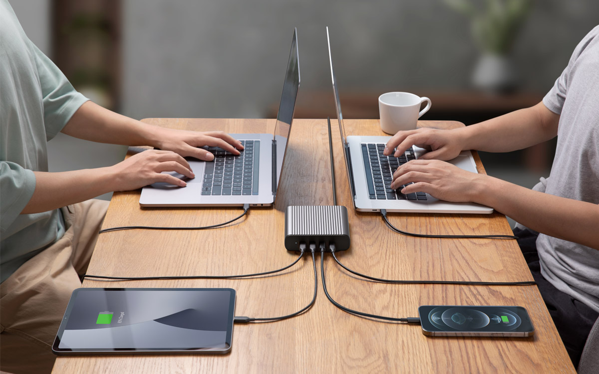 最先端のGaNテクノロジーによる100WのUSB-C Power Deliveryポートを4つ搭載した、合計最大245Wの高出力電源アダプタです。高電力で充電が必要なMacBook Proやその他ノートPC、タブレットなど最大4台まで充電が可能です。PCやモバイルデバイスのハイスペック化による充電パワー不足を解消します。ビジネス用途にも最適です。