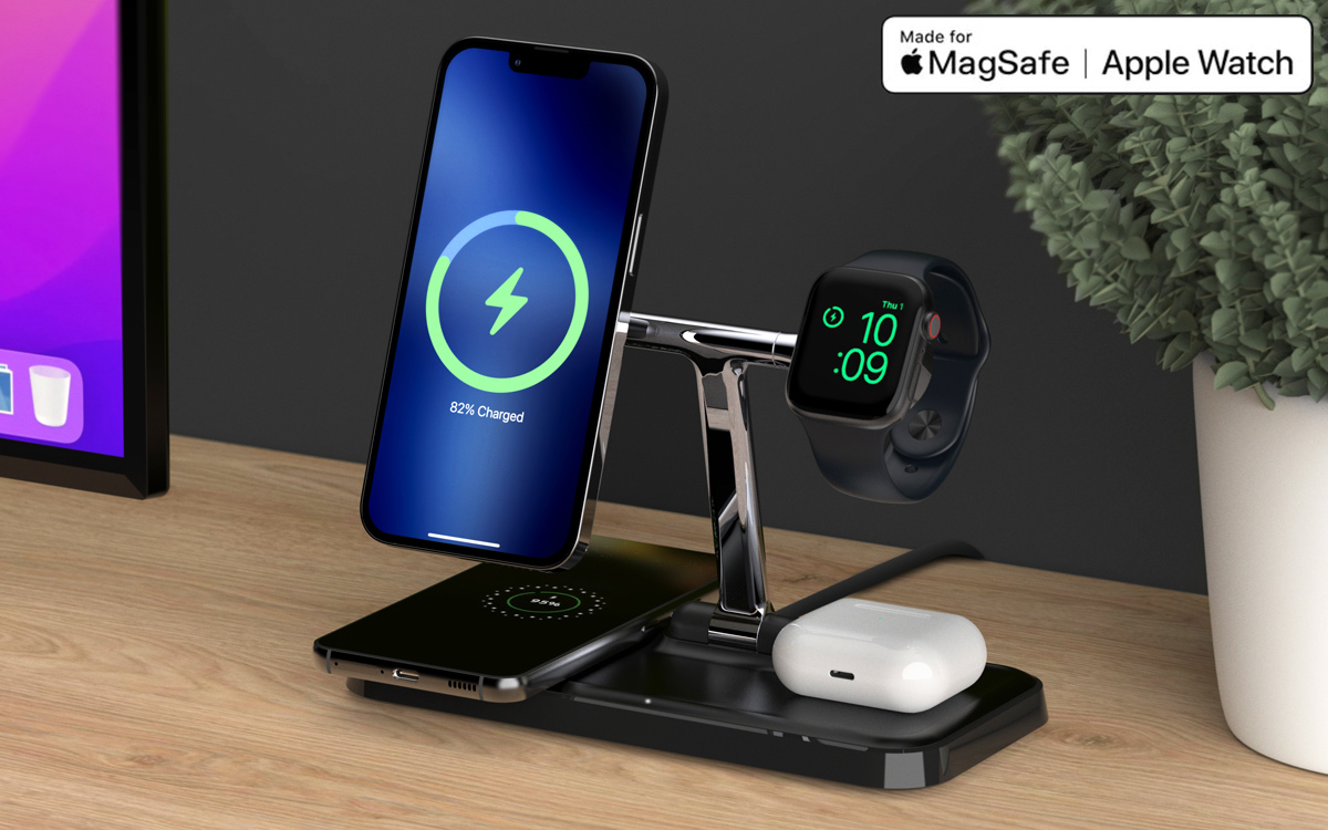 MagSafe対応のiPhoneにApple WatchとAirPods、さらにもう1台のデバイスまで、合計4台を同時にワイヤレス充電可能。Apple社によるMade For MagSafe認定を受けた高品質な折りたたみ式充電スタンドです。最大15WでiPhoneを充電可能です。MagSafeスタンドは角度の調整が可能です。折りたたみ式で持ち運びに最適で旅先などで当製品1台で全てのモバイル端末の充電が可能です。