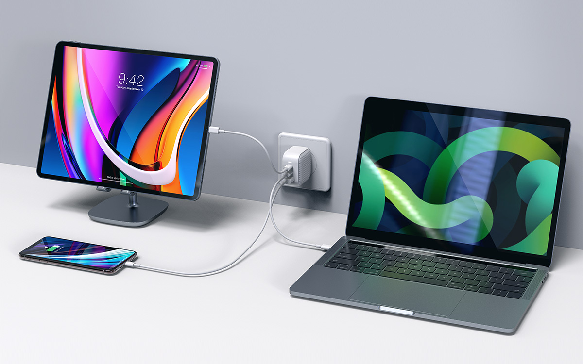 世界最小クラスの66W(2x USB-C/1xUSB-A) GaNアダプタです。PD3.0に対応した2つのUSB-CポートとQC3.0対応のUSB-Aポート、合計3つのポートで合計最大66Wの充電が可能です。MacBookからiPhone、Apple Watchなど、まとめて急速充電に対応します。