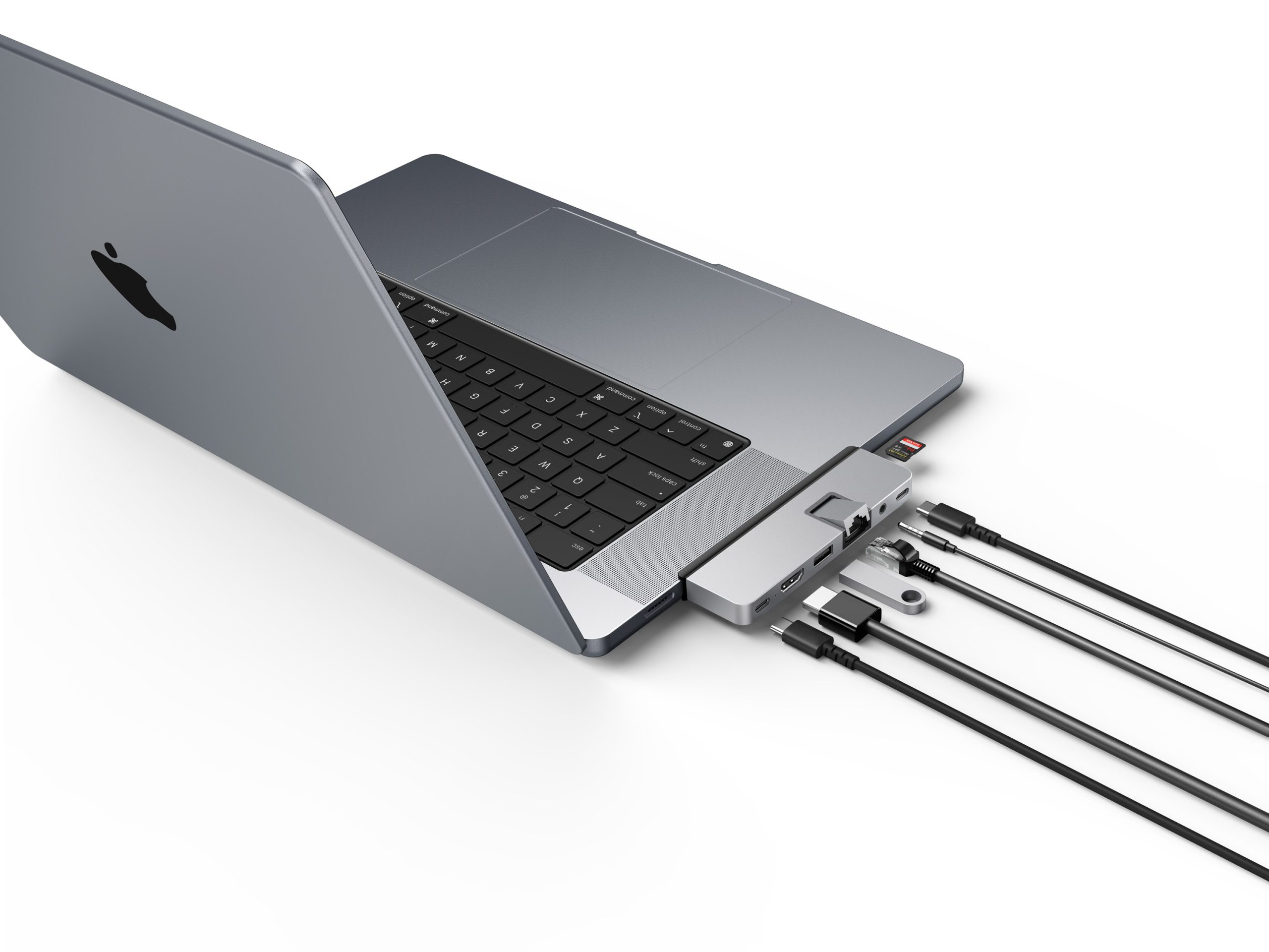 MacBook Pro/Airに一括して機器を接続できる、MagSafe 3 充電ポートに干渉しないスタイリッシュなダイレクトプラグイン仕様の7in2 USB-Cハブです。Thuderbolt 4/USB4、4K60HzのHDMI、ギガビットイーサネットなど機能性の高いポートから、USB-C/A、microSD/SDカードスロット、3.5mmオーディオジャックなど汎用性の高いポートを搭載しています。厚み約1センチのスリムさでMacBookの一部のような一体感のあるデザインも特徴です。