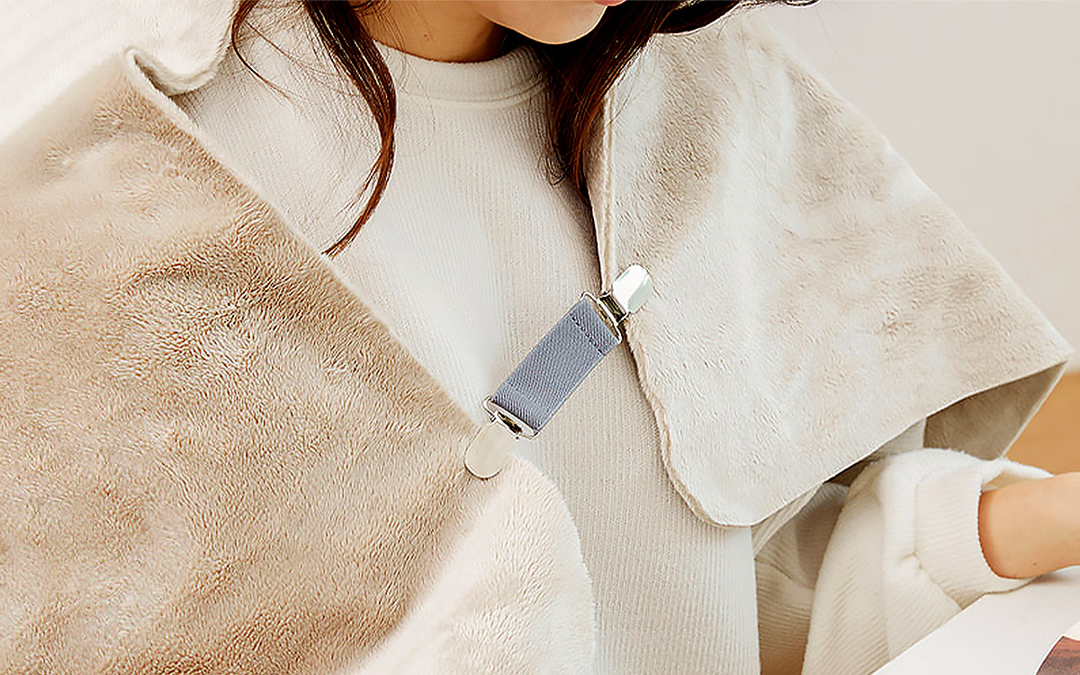 当製品は、マイクロファイバー素材の毛先を長くすることで、毛布のような触り心地の電気ブランケットです。同梱の固定用クリップで肩から羽織ったり、下に敷いてみたり使い方色々。インクで温めるINKOシリーズ最大の発熱面積です。