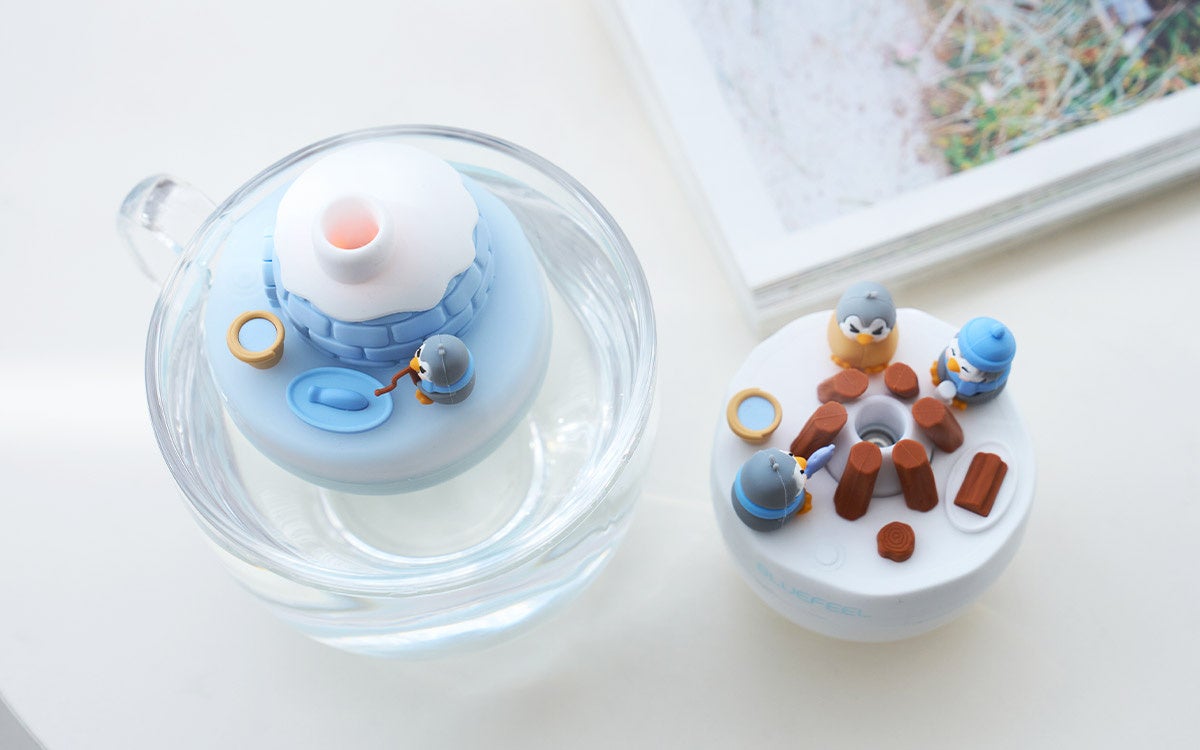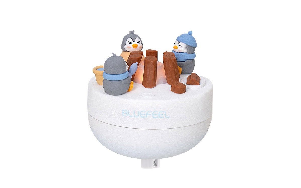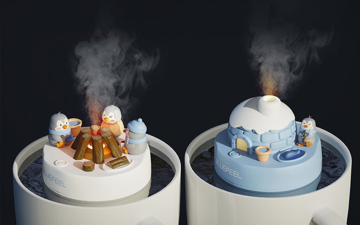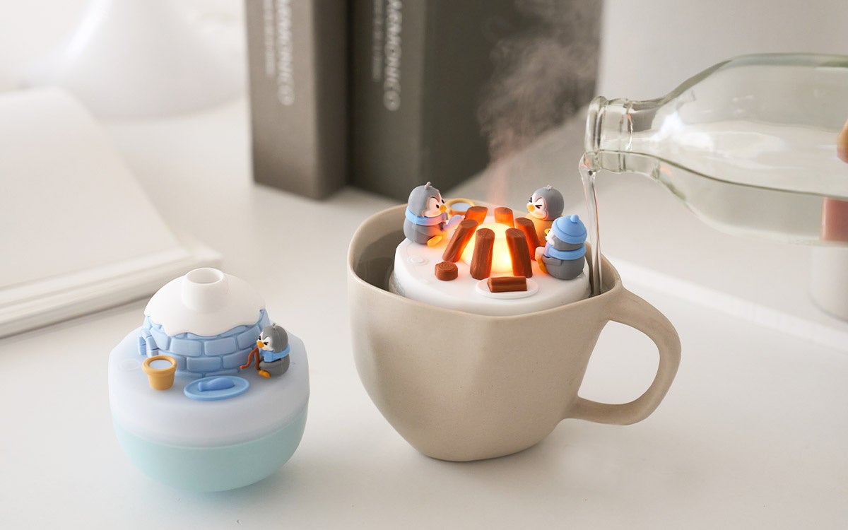 「DoongDoong」は、コードレスで、コップと水さえあればどこでも加湿が可能です。水タンクを交換する手間は必要ありません。ペンギンが釣りをする愛らしいデザインや、温かそうにたき火を囲む仲間たちが、ご家庭やオフィスのどんな空間にも楽しさと温もりをもたらします。