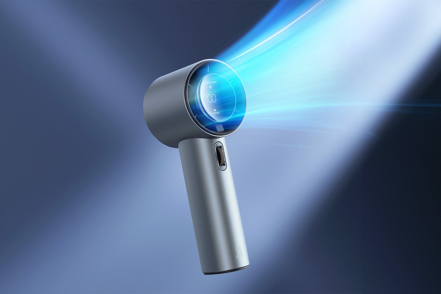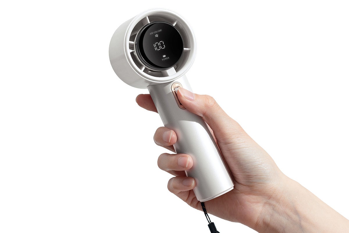 当製品はは、軽量でコンパクトサイズながら、1分間に15,000回転するモーターが生み出す超強力な風が特徴の高機能ハンディファンです。LEDディスプレイや100段階風力調整など、多彩な機能を盛り込んでいます。羽根を隠すデザインで子供でも安全に使用できます。